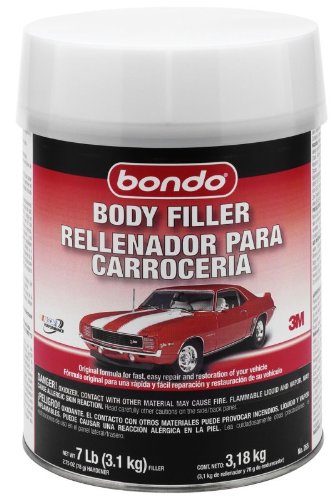 Bondo Auto Body Filler is a two-part putty compound that can be used to repair dents, dings, holes, rusted areas and scratches in vehicle exteriors. Bondo Body Filler cures fast, shapes in minutes and is formulated to be a non-shrinking and permanently durable material. In addition to its uses on vehicle exteriors and other metal surfaces it is also a suitable repair option for wood, fiberglass and concrete. DIY repair for multiple surface materials View larger. How It WorksBondo Auto Body Filler consists of two compounds: a resin based filler and a hardening agent. A tube of the hardening agent is included with the container of Bondo Auto Body Filler. The consistency of both compounds is creamy, but as the hardening agent is blended together with the filler it acts as a catalyst, creating a chemical reaction which thickens the new mixture into a paste. Bondo Auto Body Filler products include directions containing simple mix ratios that make for convenient measuring out of both compounds without any waste. The compounds should be blended away from the area to be repaired on a handheld mixing palette or other maneuverable flat surface using a flat edged spreading tool (palette, spreading tool and recommended eye protection, mask and solvent resistant gloves sold separately). The result is a rapidly thickening adhesive mixture that can be spread on and will stick to correctly prepared surfaces and spaces. The mixture cures quickly, shapes in minutes and will accept as many reasonably applied applications as required to fill holes and deep scratches or dents. It is is formulated to be a non-shrinking and permanently durable material. Once completely hardened Bondo Auto Body Filler can be sanded using various grits to achieve as smooth a finish as required. The filled, area as well as the area immediately surrounding it should be covered with Bondo Glazing and Spot Putty (sold separately). Feather sanding this creates a consistent sloping surface that can then be painted with standard gray auto primer and an outer coat and clear coat finish. In addition to its uses in repairs of typical vehicle surfaces Bondo Auto Body Filler is also suitable for repairs of other surfaces including wood, steel, aluminum, fiberglass, and concrete. Instructions*